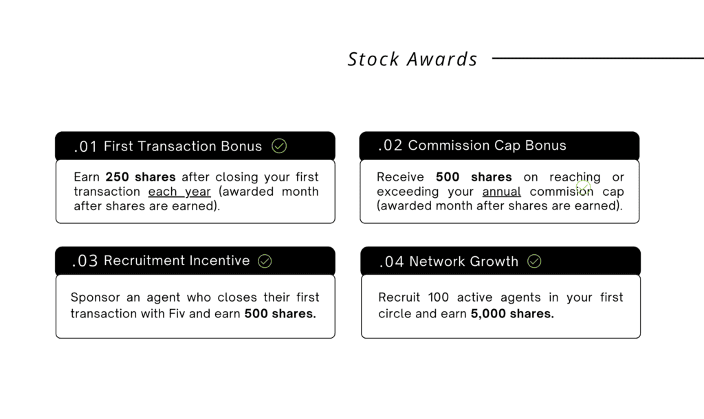 Except for those purchased directly, these awards are subject to a 3-year vesting period. Any recruited agents must be in good standing with the brokerage, and both the sponsor and sponsored agent must be active at the time of vesting. All participants in the plan will be subject to and should fully understand the terms and conditions set forth by management in the company’s formal Stockholder Agreement.